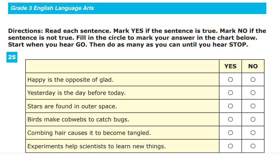 States have experimented with measuring aspects of this in reading. Tennessee came close around 2020 with a foundational literacy fluency component on the TCAP ELA assessment (especially in Grade 2). It was a simple yet powerful timed task: students read short, grade-level statements and quickly marked YES or NO to indicate if each was true. In a minute or so, it gauged decoding speed, basic vocabulary, and instant comprehension—exposing gaps that many elementary programs overlook. See the snippet below:
